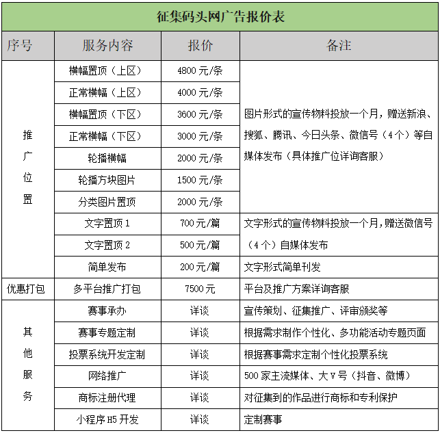 征集碼頭網(www.zslhts.com)為國內征集競賽服務平臺,為企事業單位提供賽事承辦、網絡推廣、專題定制、投票系統開發、商標注冊等服務;