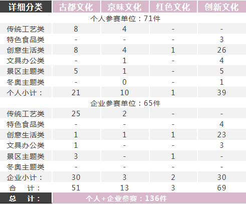 入圍復賽的136件作品,按照作品的元素取自和同系列衍生品的方式整合為85件(套)作品,依次劃分至古都文化、京味文化、紅色文化、創新文化四大主題。其中包含本地特色旅游商品、市級區級文化非遺類作品、區內文化IP衍生品及概念性文化創作四大類別作品,覆蓋領域涵蓋傳統工藝類、特色食品、創意生活類、文具辦公類、景區主題類、冬奧主題類等多種細分項目。