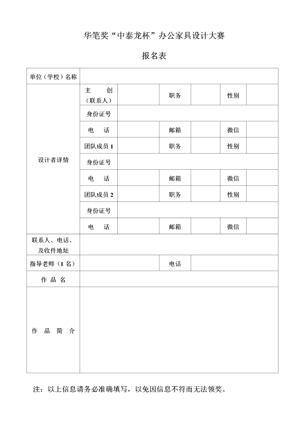 1、《參賽報名表》(請登陸“廣東家具網www.chinagdf.com.cn”下載填寫):參賽者務必如實填寫報名表上各項信息,若以團體名義參賽,請填寫團體名稱以及負責人姓名,以便主辦方與您取得聯系。報名表文件名以“作者姓名——作品名稱”命名。