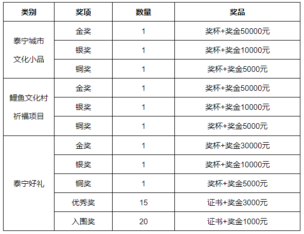 1.本次大賽共征集“泰寧城市文化小品”“鯉魚文化村祈福項目”“泰寧好禮”三個類別作品,每個類別評選出金、銀、銅獎,并頒發獎金和獎杯;“泰寧好禮”類別另外再評選出優秀獎和入圍獎,并頒發獎金和獲獎證書。獎項設置具體如下: