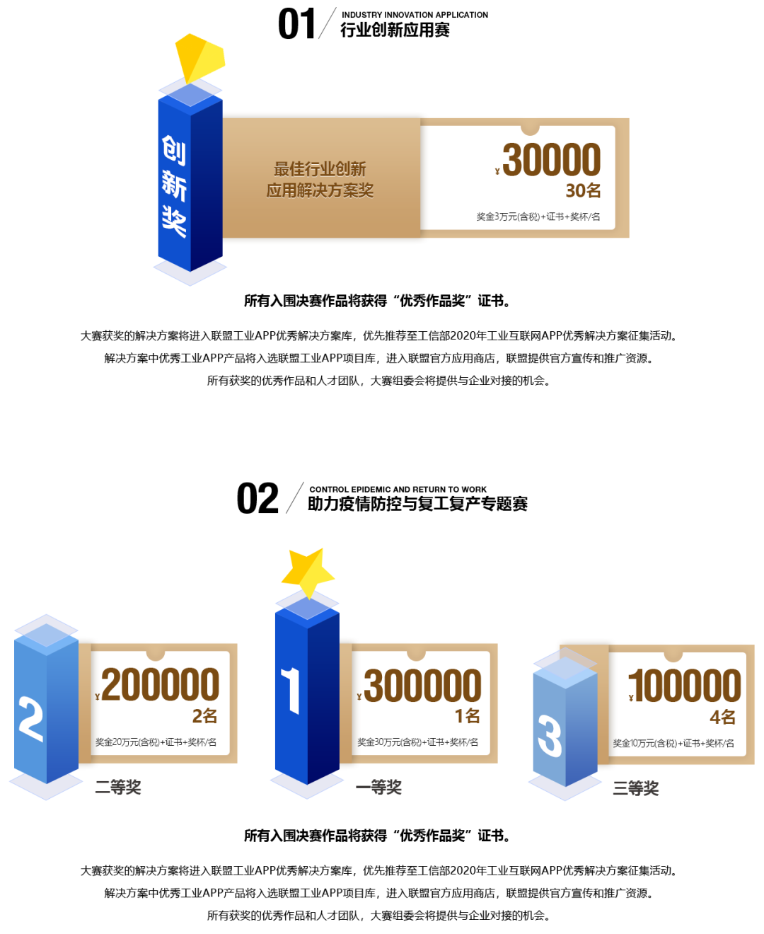 對于入圍決賽的工業互聯網APP優秀解決方案,按照優秀行業應用和助力疫情防控與復工復產突出貢獻兩大賽項進行分組。